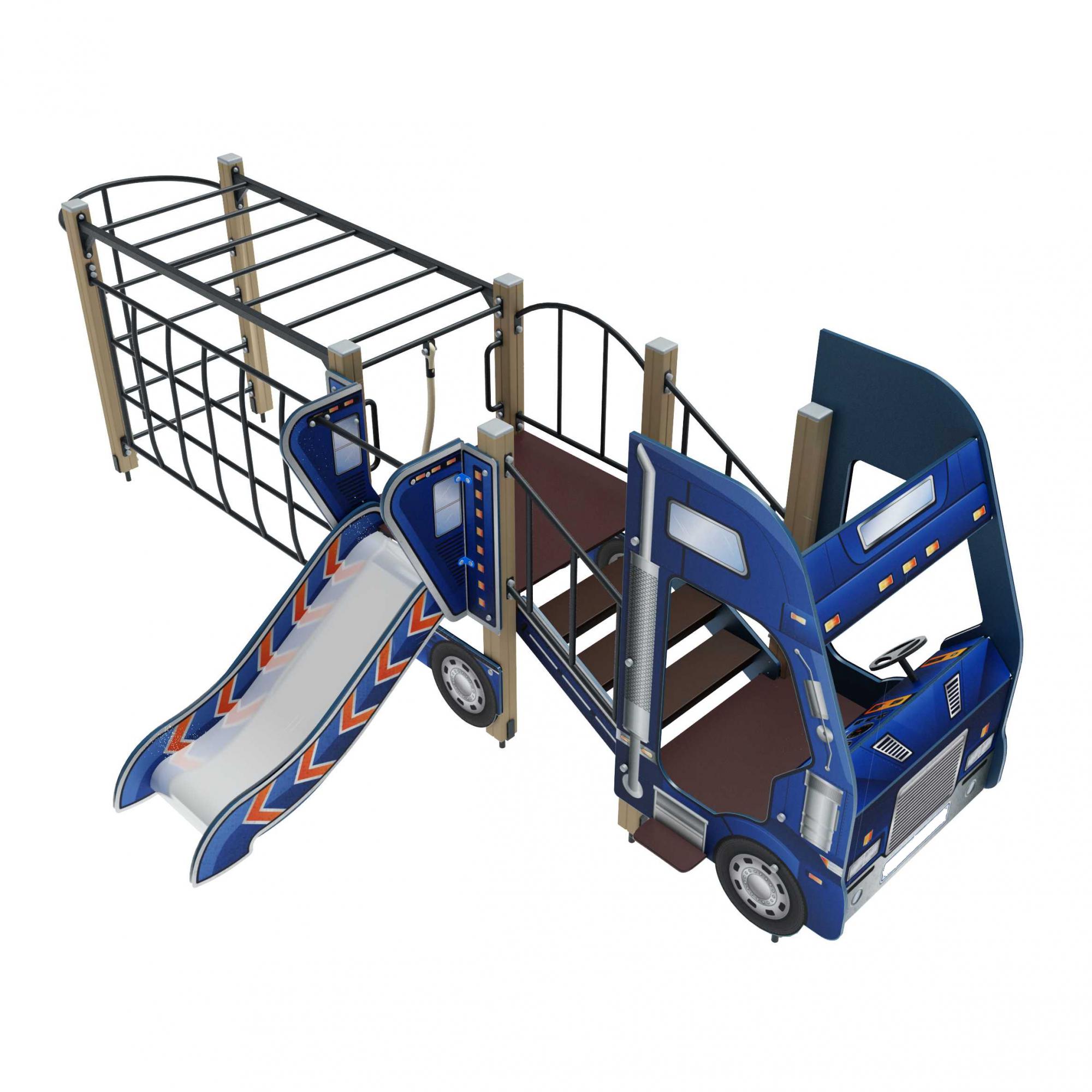 Комплекс для игр Грузовик ПДИ 1.25 могут посещать дети от трех до семи лет. Конструкция состоит из одной решетки для лазания, каната, одного рукохода, одной горки, двух башен, шеста, декоративных элементов. По стальной решетке дети могут лазить и укреплять мускулатуру. Для изготовления комплекса использованы следующие материалы: труба диаметром 27 и 32 мм; стальной профиль 40 х 25 мм; лист нержавеющей стали толщиной 1,5 мм; ламинированная фанера 18 мм с не скользким слоем, фанера влагостойкая с толщиной 18 мм; клееные брусья 100х100 мм. Края фанеры имеют закругленные формы. Для окрашивания фанеры использована стойкая двухкомпонентная полиуретановая краска с отвердителем. Две башни невысокие с высотой пола 300 мм и 750 мм от уровня планировочной площадки. Скат горка имеет ширину 540 мм. В зоне свободного скольжения высота бортов составляет 150 мм. Перекладины на рукоходе и решетке выполнены с шагом 300 мм. Все металлические конструкции окрашены износостойкой порошковой краской.Комплектация конструкции ПДИ 1.25