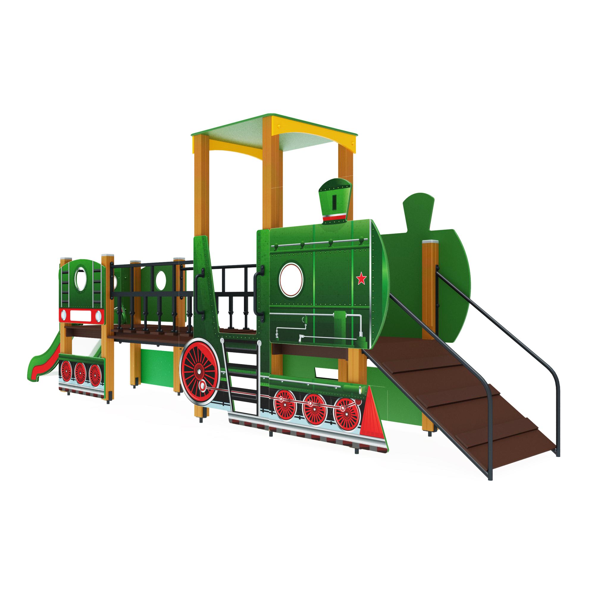 Паровозик состоит из лестницы, горкой, подвесного моста и двух башен, одна башня стилизована под паровоз, другая под вагон. Кабина имеет вход в виде лестницы с перилами. Также в кабине паровоза расположены два фанерных ограждения на металлических ножках. Вагон — закрытая площадка, имеет горку, декоративную арку и два фанерных ограждения с рисунком. Снизу по бокам расположены декоративные колеса. Вагон соединён с локомотивом мостиком с фанерным ограждением. Вся конструкция крепится на деревянных столбах. Закрытые вагоны удобны для перевозки людей или мелких грузов. Данный комплекс предназначен для детей от 2-х до 3-х лет.